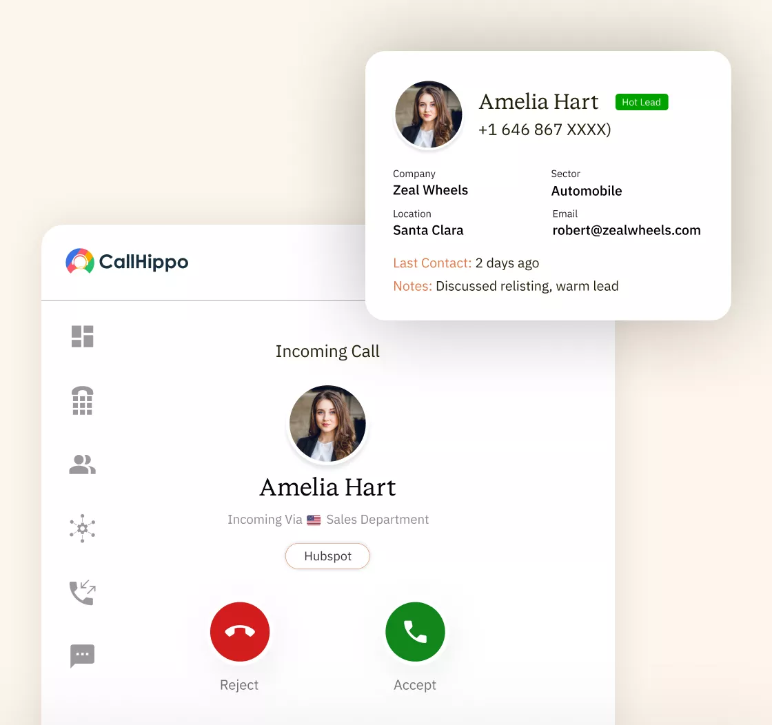 CallHippo matches the incoming number to your CRM and instantly surfaces the caller's name, company, phone number, email, and location before your agent has said a word.