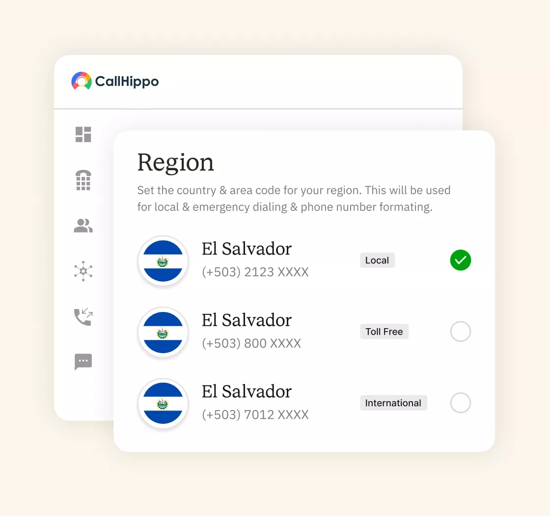 CallHippo ofrece principalmente números de teléfono virtuales permanentes de El Salvador para empresas. Mientras que los números temporales no son parte de nuestra oferta estándar, usted puede obtener un número virtual sin presencia de oficina física. Le permite a su negocio construir una presencia local en El Salvador.
